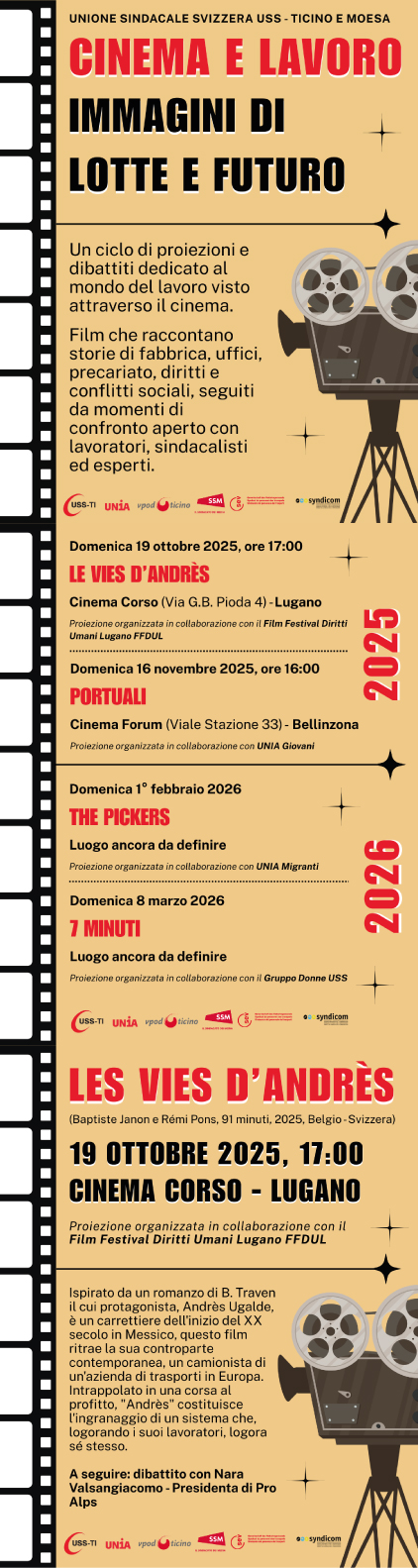 Il primo appuntamento sarà domenica 19 ottobre, alle ore 17:00 al Cinema Corso di Lugano, in collaborazione con il Film Festival Diritti Umani Lugano FFDUL, proiezione del film “Les Vies D’Andrès”. Ispirato da un romanzo di B. Traven il cui protagonista, Andrès Ugalde, è un carrettiere dell'inizio del XX secolo in Messico, questo film ritrae la sua controparte contemporanea, un camionista di un'azienda di trasporti in Europa. Intrappolato in una corsa al profitto, "Andrès" costituisce l'ingranaggio di un sistema che, logorando i suoi lavoratori, logora sé stesso.