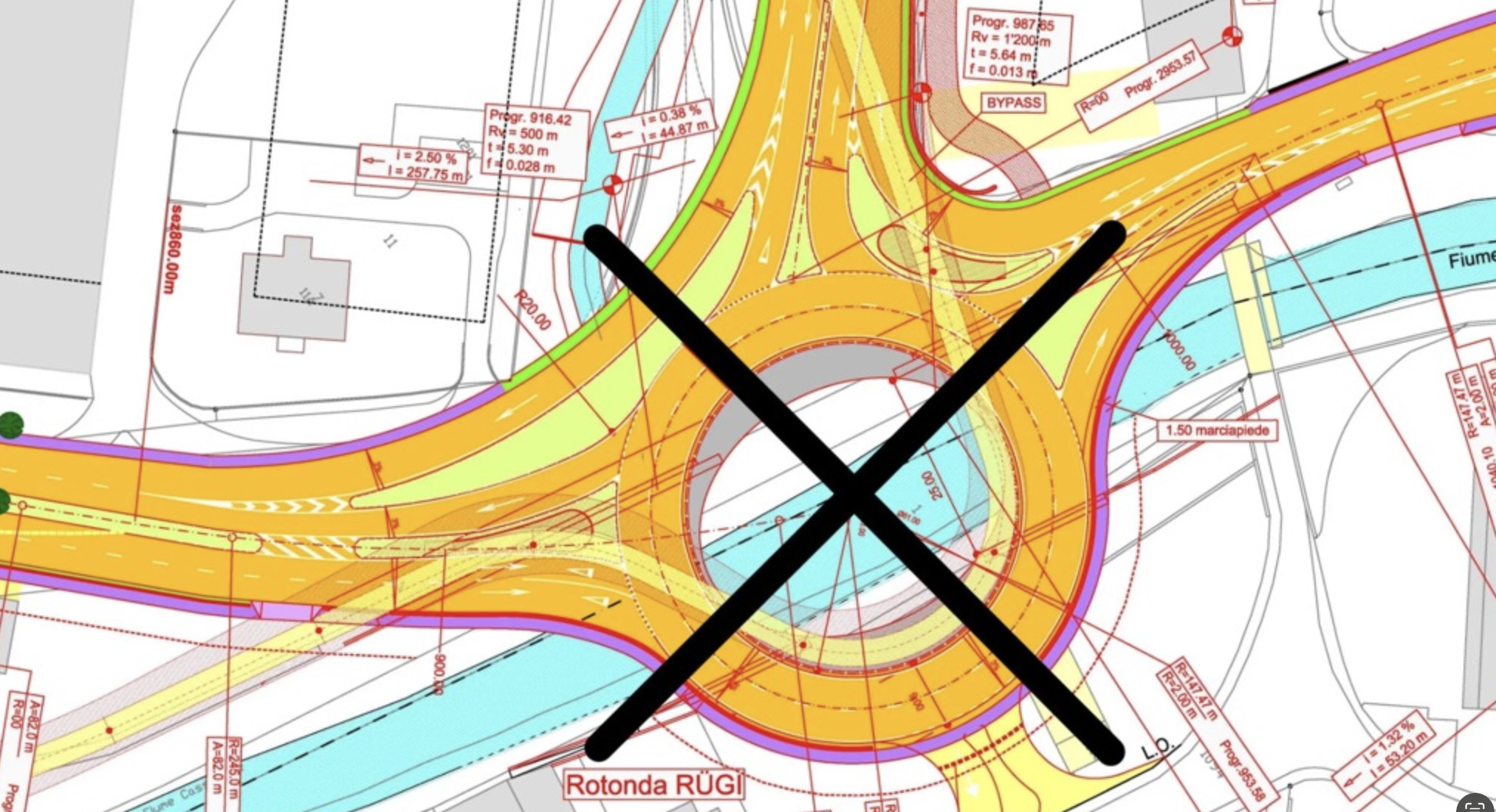Non entreremo nei dettagli della disputa, ma vale la pena di suggerire, al cittadino inesperto, di osservare il progetto così come presentato in immagine: la rotonda è una struttura invasiva e sopra di essa passa una ciclopista, con pendenza del 6%, assurda e inutile, perché potrebbe scorrere semplicemente a livello del suolo.